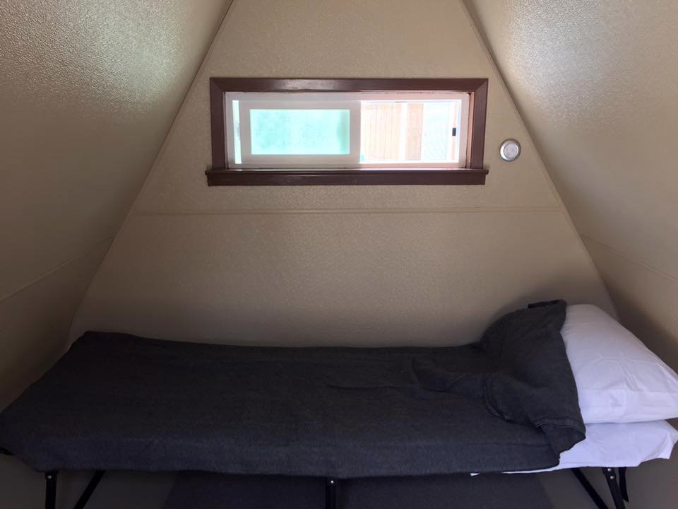 HUTの主要な目的は、眠る場所とプライバシーとの提供なので、中はベッドとカーペットと小窓があるだけで、非常に狭くシンプルなつくりになっています。