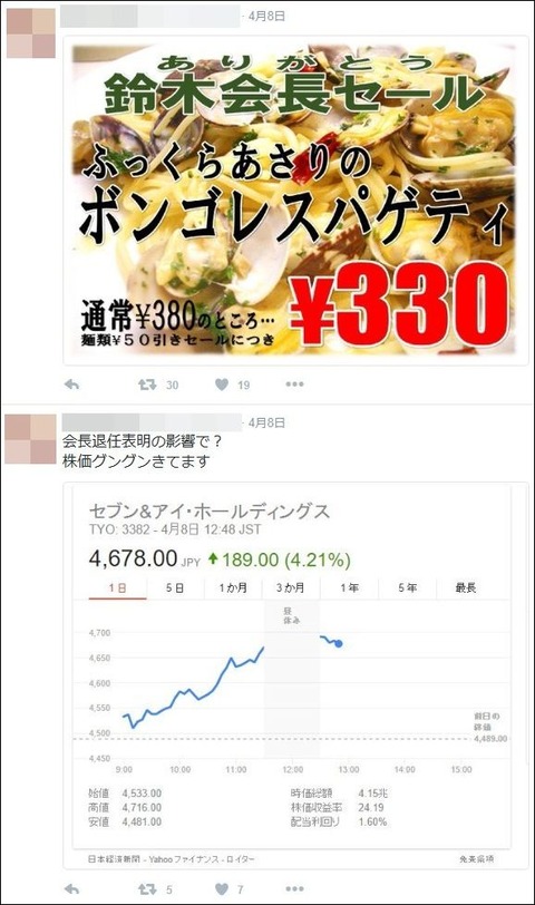 店舗関係者らの氏名及び携帯電話の番号等が記された掲示物が写っていた。本社の方針を批判するツイートも目立つ。鈴木敏文氏の退任の際には、「会長退任表明の影響で?株価グングン