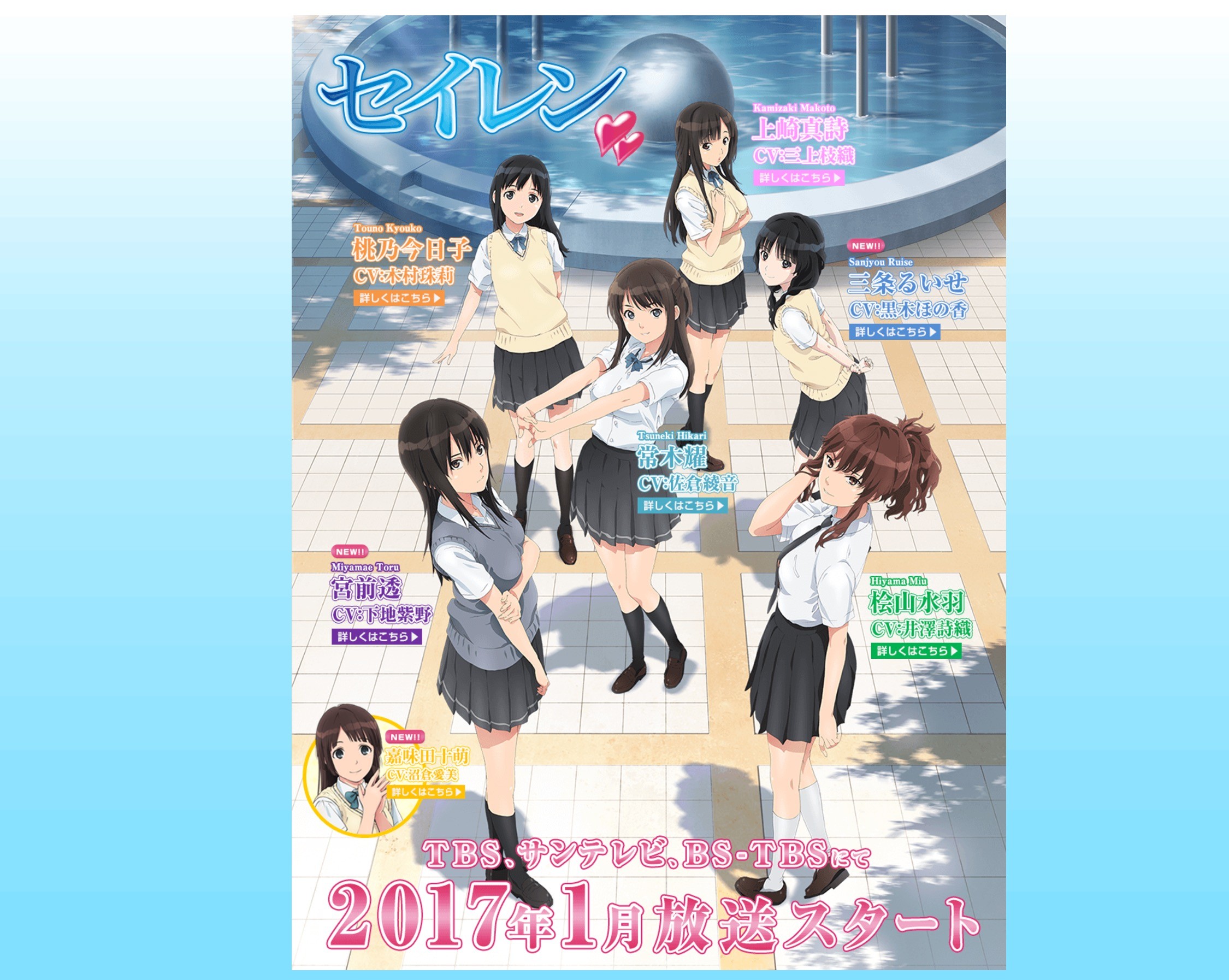 2017年1月より放送するTVアニメ「セイレン」の追加キャラクター紹介とキャストが発表されました。「鬱屈な風紀委員」三条るいせ、「クリティカルな先輩」宮前透、1時間前【キャラ解禁⑦】「弟の成長をうながすミスサンタ」嘉味田十萌の3人が発表されています。キャストはそれぞれ、黒木ほの香さん、下地紫野さん、沼倉愛美さんが担当します。