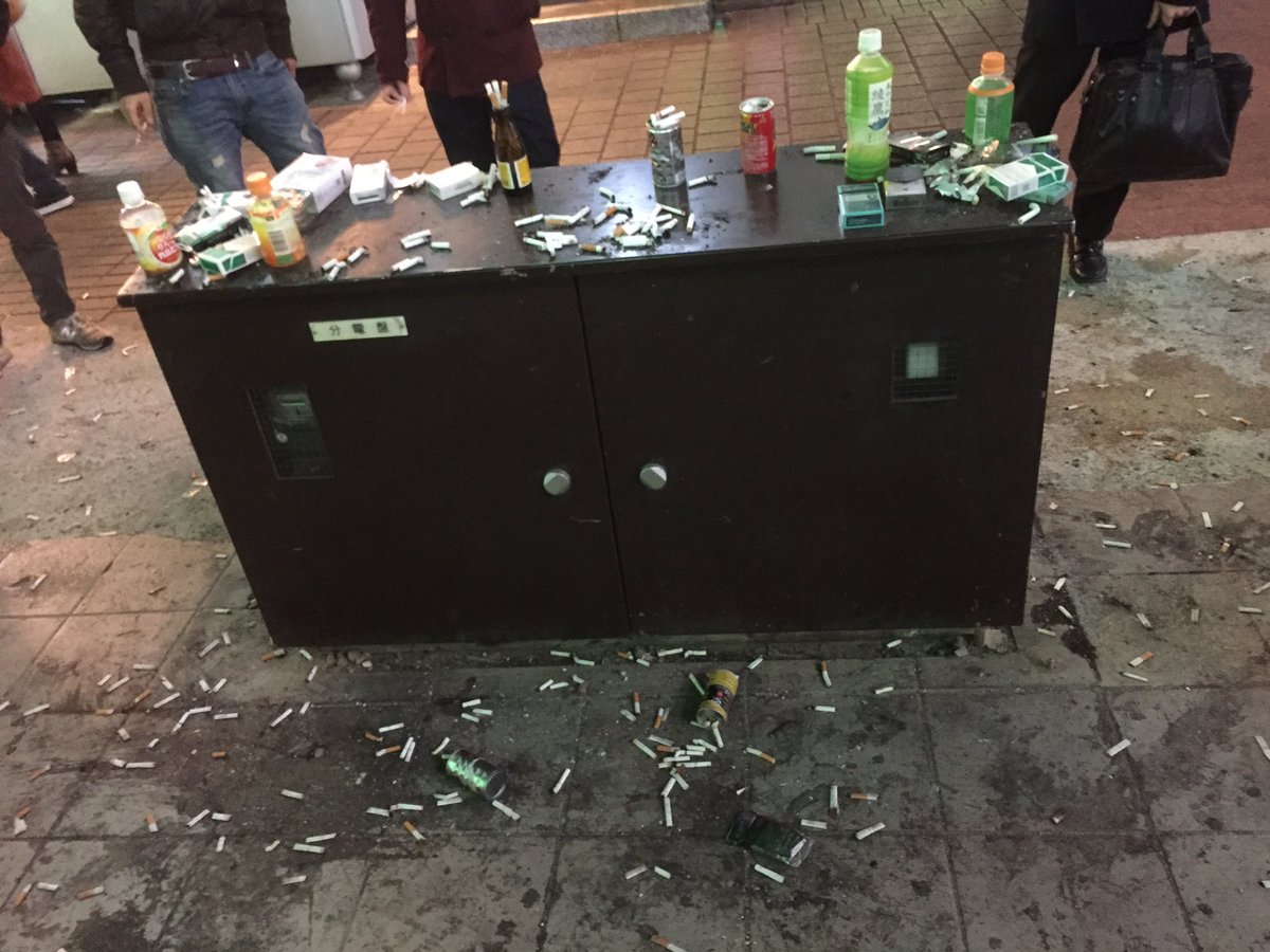 ピークタイムではないのに30人くらいタバコ吸ってるし、灰皿なくてこんな感じ。