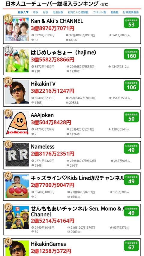 ヒカキンTVの収入…3億2216万 はじめしゃちょーの収入…3億5582万