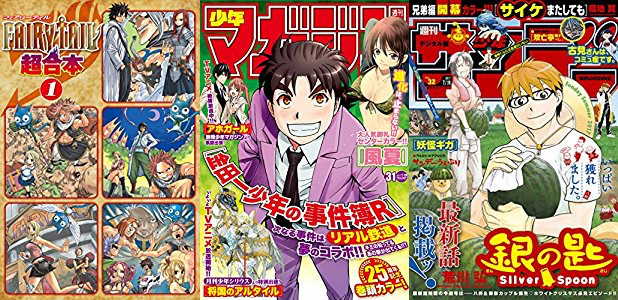 コミックスでは、もうすぐ完結を逢える「FAIRY TAIL」の5巻分がセットになった「超合本版」が配信スタート!12巻まで発売されていて、1巻は0円となっています。また週刊少年マガジンも配信です(講談社新刊)。そして週刊少年サンデー最新号では、あの「銀の匙」が掲載されますよ!