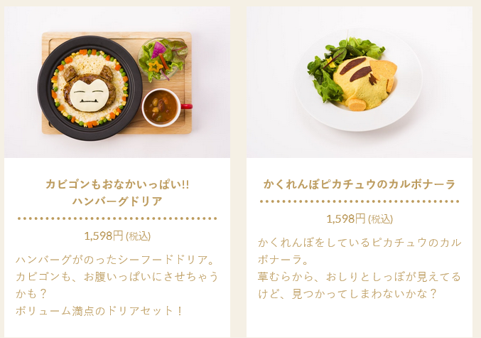 元気いっぱいピカチュウカレー 1,598円 (税込)カビゴンもおなかいっぱい!!ハンバーグドリア 1,598円 (税込)