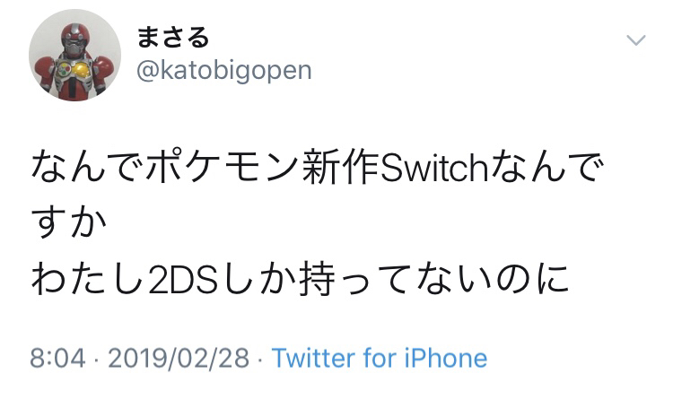 ホーム > 未分類 > Twitter民「ポケモン新作、なんでSwitchなんだよぉぉ!!」 2019/03/01 Twitter民「ポケモン新作、なんでSwitchなんだよぉぉ!!」 1: 2019/02/28(木) 12:07:38.98 ID:MEy6lfQH0 続きを読む - 未分類