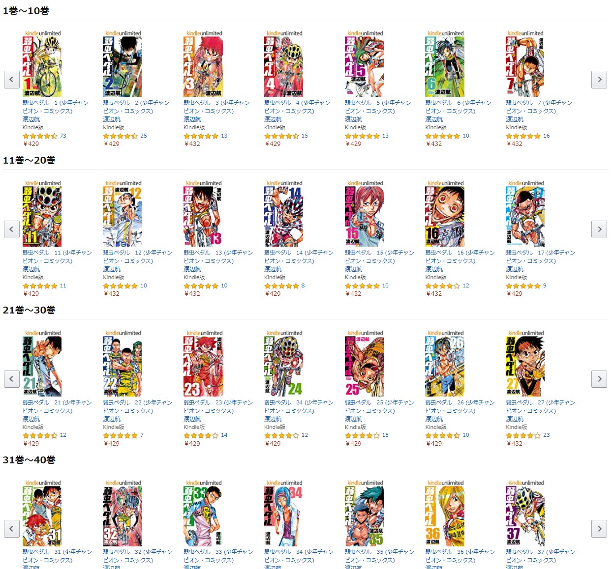 4月1日追記。「弱虫ペダル」1~40巻がKindle Unlimited読み放題に入りました。