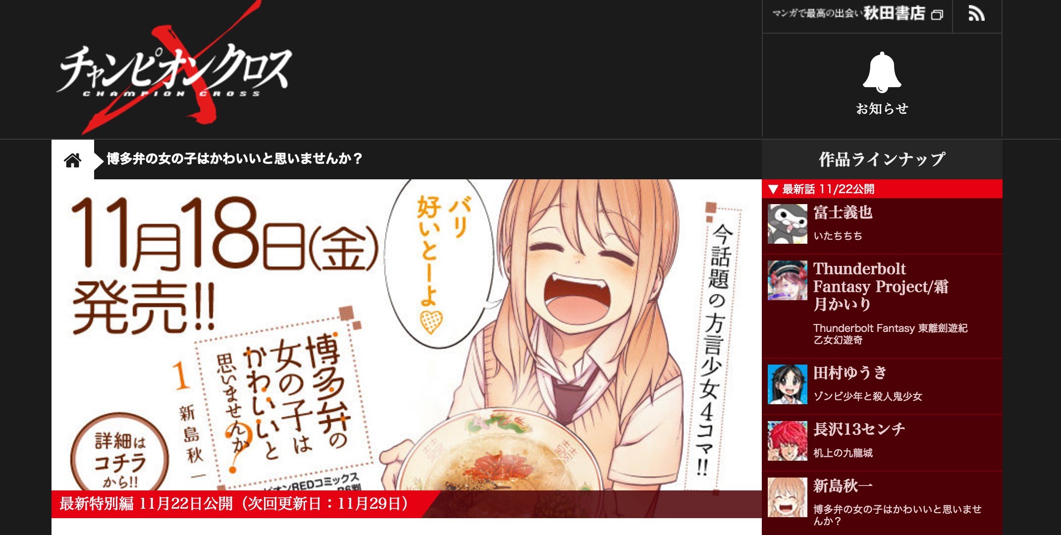 新島秋一さんによるチャンピオンクロス連載作「博多弁の女の子は可愛いと思いませんか?」第1巻があまりにもかわいすぎたの感想レビューをしちゃう、そんな記事です。以下、ネタバレを含みますので、読む前にまずは漫画読んじゃいましょう!