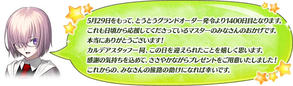「Fate/Grand Order(FGO)」が、5月29日でスタート1400日目。それを記念したキャンペーンが5月29日に行われます。