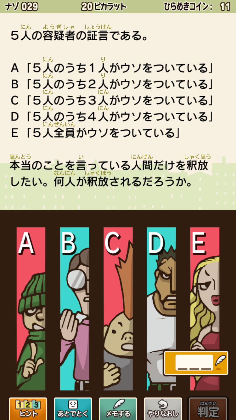 全員が違うこと言ってるので、正しいのは1人だけ。