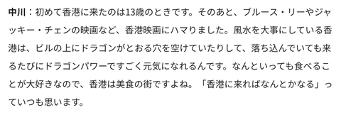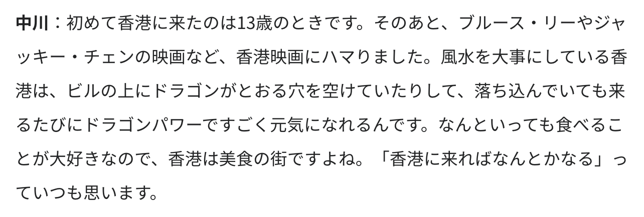 中川:初めて香港に来たのは13歳のときです。そのあと、ブルース・リーやジャッキー・チェンの映画など、香港映画にハマりました。