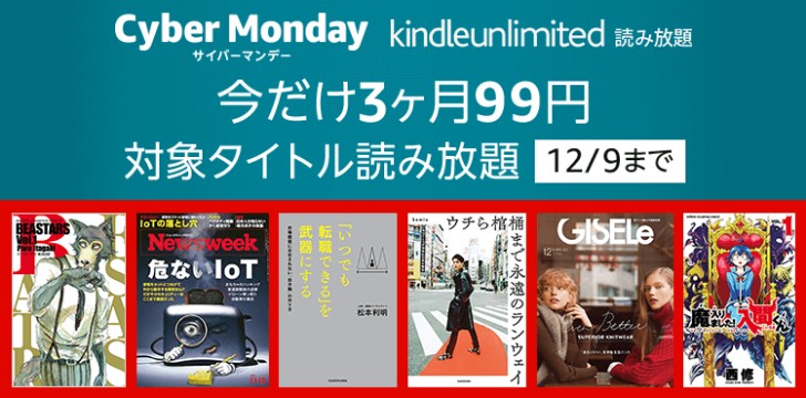 Kindleで、サイバーマンデーセール開催。それに合わせて、Kindle Unlimited読み放題キャンペーンがスタートしました(12月9日まで)https://t.co/s9BADIg3RZ