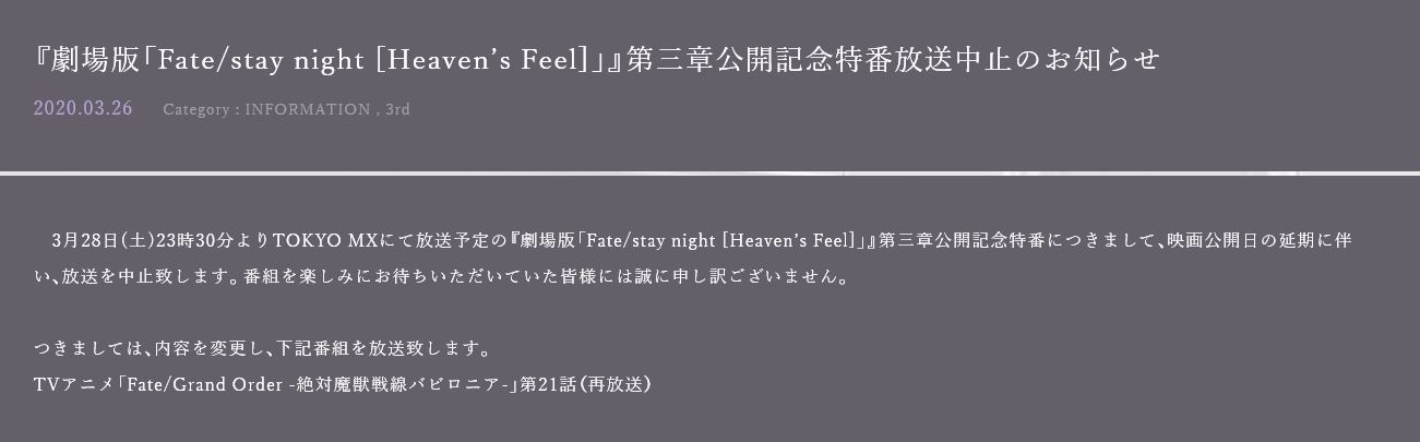 新型コロナウイルス感染拡大に伴う各行政機関の発表、一部映画館の休館発表等を鑑み、『劇場版「Fate/stay night[HF]」第三章』の公開を延期致します。楽しみにお待ち頂いていた皆様には誠に申し訳ありません。変更後の公開日は… https://t.co/EXoEYzUOEa