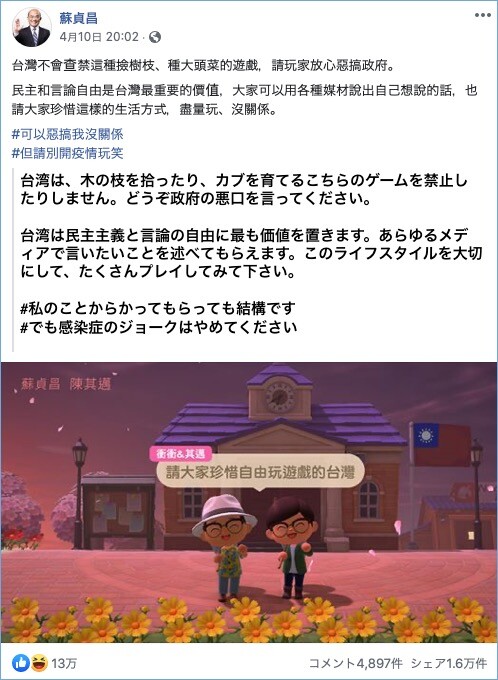 ホーム > 未分類 > 【画像】台湾首相「自由にゲームができる台湾という国を大切にしましょう」香川県「…」 2020/04/14 【画像】台湾首相「自由にゲームができる台湾という国を大切にしましょう」香川県「…」 1: 2020/04/14(火) 02:52:44.49 ID:4pxrPZ190 台湾首相「政府批判も言論の自由。どんどん批判してほしい」 どうぶつの森のゲーム内発言「自由にゲームができる台湾という国を大切にしましょう」 続きを読む - 未分類
