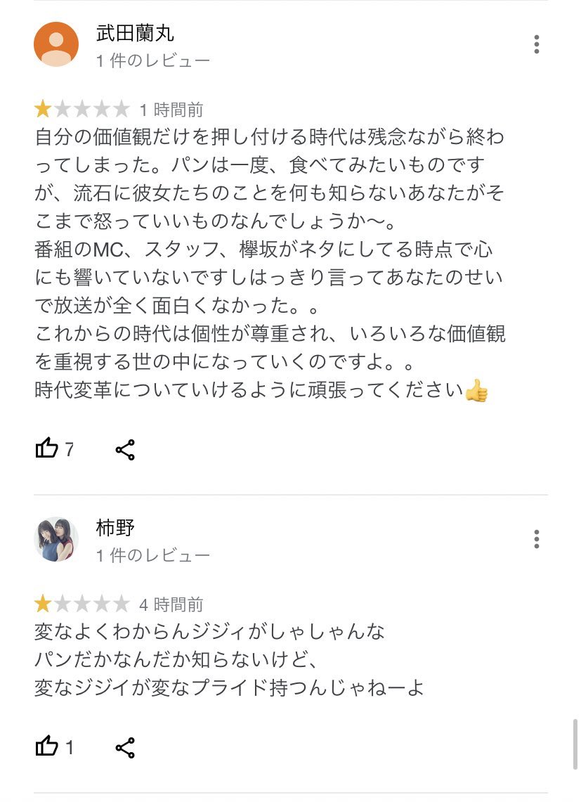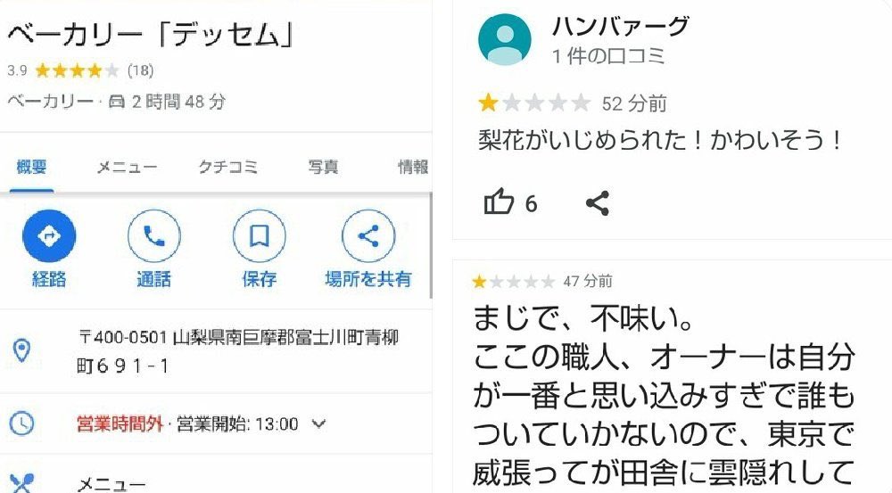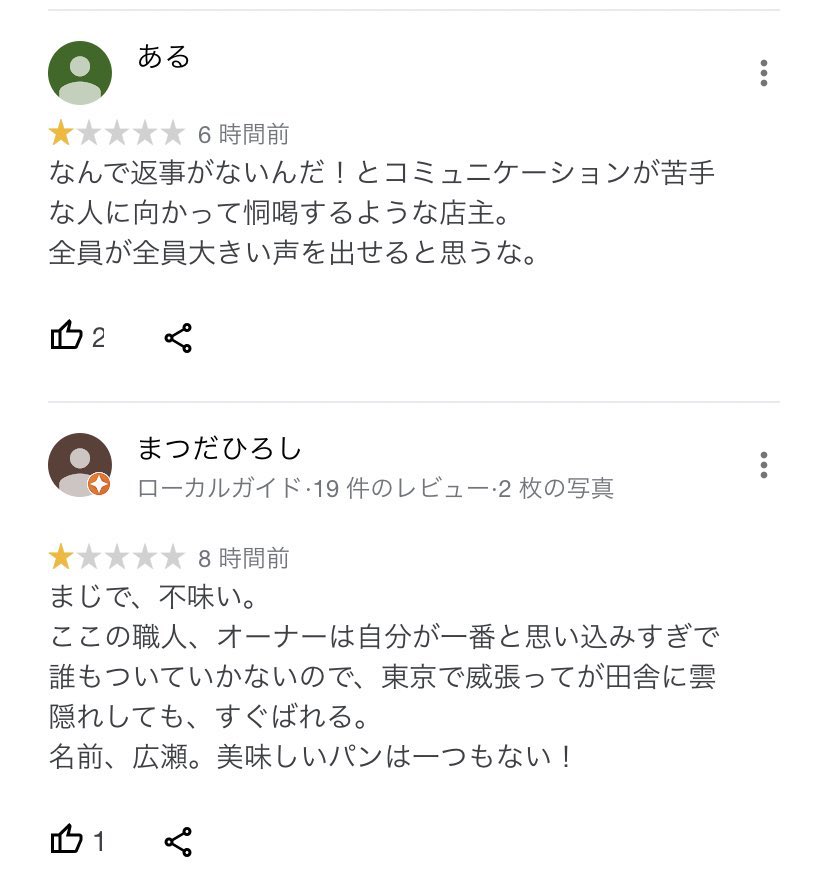 ホーム > 未分類 > 【悲報】ドルオタさん、パン屋のレビューを荒らしてしまう… 2020/04/22 【悲報】ドルオタさん、パン屋のレビューを荒らしてしまう… 1: 2020/04/20(月) 12:44:22.48 ID:S+FPL63q0 欅坂のアイドルが番組の企画でパン屋の修行を体験させてもらう ↓ パン屋の店主が丁寧に指導するが、欅坂のアイドルは挨拶も返事もせずに作業を続ける ↓ パン屋の店主が切れて、挨拶、返事は社会生活の基本だと叱る ↓ 欅坂オタクが切れてパン屋のレビューを荒らしまわる ↓ 続きを読む - 未分類