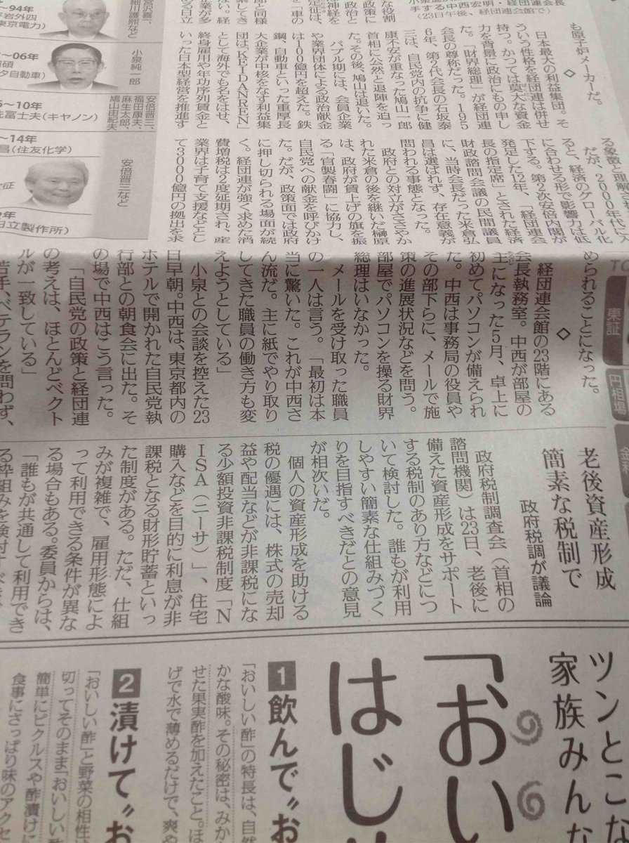 記事によると、中西会長は2018年5月、経団連会館内にある会長執務室に初めて卓上のパソコンを設置したという。これまでは「部屋でパソコンを操る財界総理はいなかった」が、事務局の役員やその部下に、メールで仕事の指示・確認をするようになったそうだ。