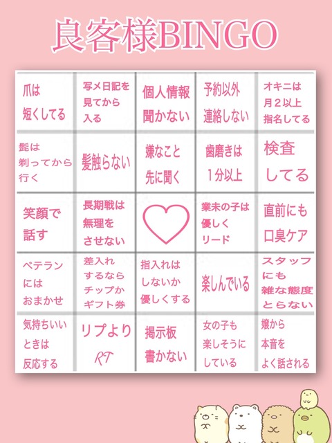 夜のサービス嬢「良客の特徴挙げた。ビンゴしなかったらクソ客だから♡」