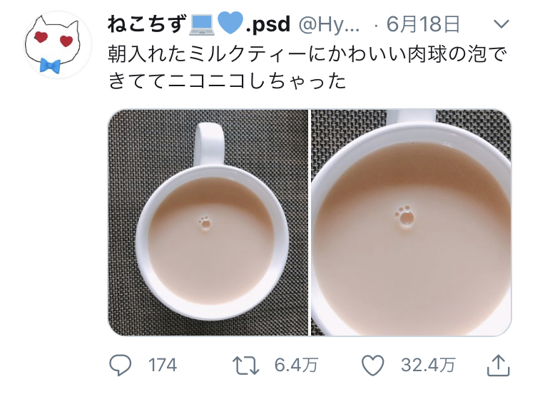 ツイカス「ミルクティーに肉球の泡ができた」←32万いいね (※画像あり)