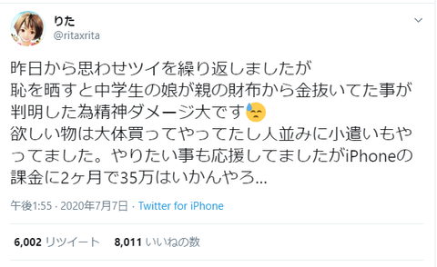 【悲報】女子中学生さん、親の財布から35万抜き取って配信者に貢いでしまうwwwwwwwwwww