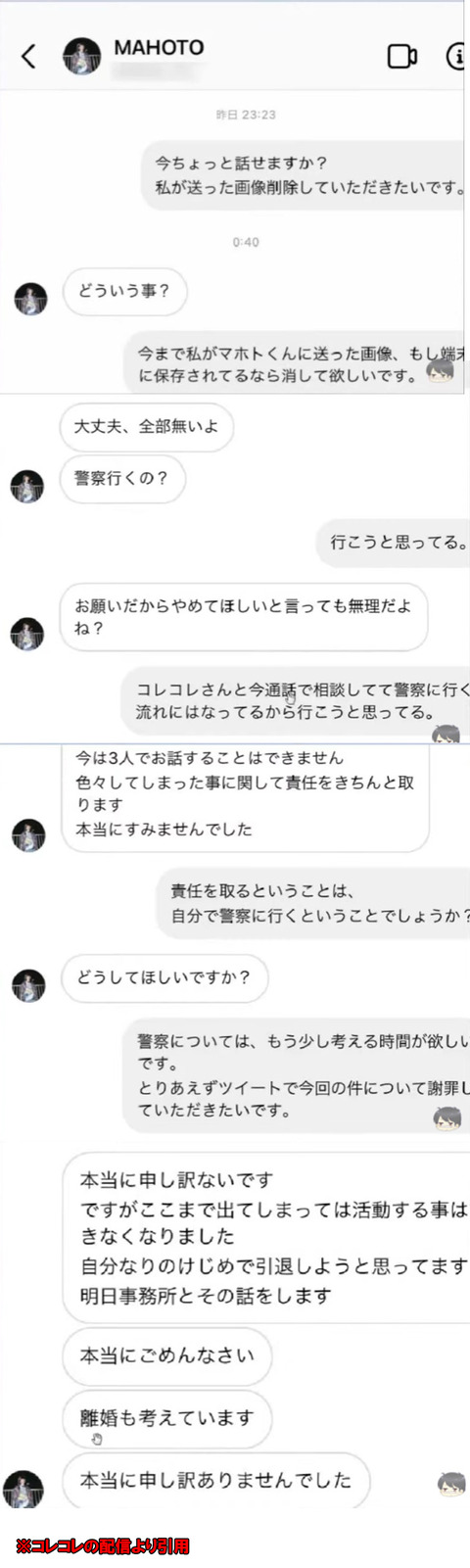 この件を暴露したら弁護士を使うと女子高生に脅し口封じをしていた。女子高生は画像の削除を要求するも要求に応じず連絡も無かったため、配信者のコレコレに相談することになった。