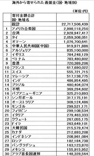 【画像】震災の時に日本に寄付してくれた国家の援助金ランキングwwwwwwwwwwwwwwwwwwwwwww