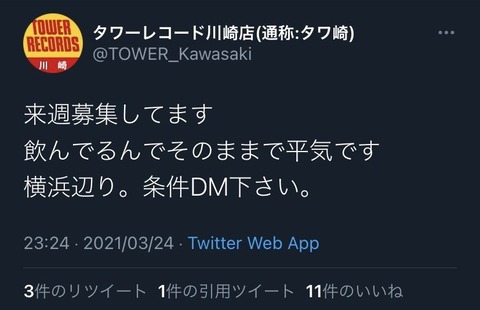 ●タワーレコード川崎店 パパ活ツイートを誤爆してしまう 川崎店「誤投稿か現在調査中」タワーレコード川崎店が公式ツイッターにとんでもない誤投稿を行ってしまった。