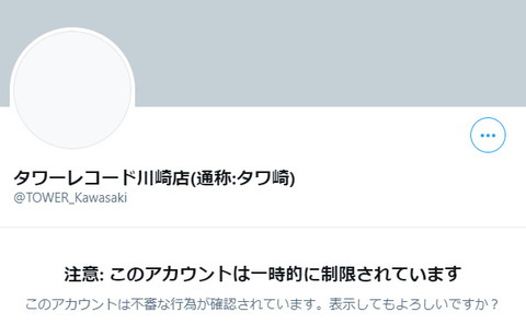 このような弊害も起きてしまう。現在タワーレコード川崎店のツイッターは「注意: このアカウントは一時的に制限されています」とされている。