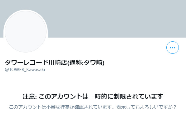 このような弊害も起きてしまう。現在タワーレコード川崎店のツイッターは「注意: このアカウントは一時的に制限されています」とされている。