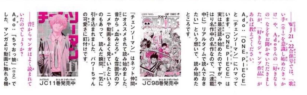 ホーム > 未分類 > 【朗報】うっせぇわのAdo(18)、「好きなジャンプ漫画はワンピースです」 2021/05/12 【朗報】うっせぇわのAdo(18)、「好きなジャンプ漫画はワンピースです」 1: 2021/05/10(月) 13:46:44.11 ID:/4oq5KtZa 船乗れ 続きを読む - 未分類