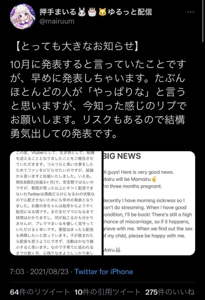 ホーム > 未分類 > 【朗報】VTuber、妊娠を発表「実は8週目。悪阻がキツいから活動縮小します。」 2021/08/23 【朗報】VTuber、妊娠を発表「実は8週目。悪阻がキツいから活動縮小します。」 1: 2021/08/23(月) 12:14:31.28 ID:1dbhu3Sma 続きを読む - 未分類