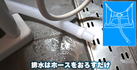洗濯槽の上から下に衣類をたたきつけることで汚れを落とす「たたき洗い」で衣類を痛めずに優しく洗うという。洗った後は排水ホースを下げて排水。水を追加で入れすすぎを行なう。