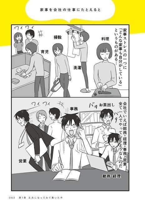【画像】この漫画の男さん「主夫になって分かった。家事を一人でやるのは総務・経理・事務・営業を兼任するようなものだ」