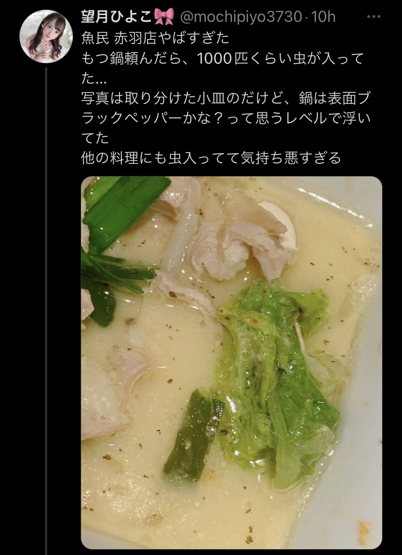 【画像】魚民、もつ鍋の中に1000匹以上の虫が混入wwwwwwwwwwww